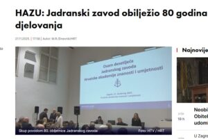 U Hrvatskoj akademiji znanosti i umjetnosti u petak 21. studenog 2025. održan je skup u povodu 80 godina Jadranskog zavoda HAZU, o čemu je izvijestio Dnevnik Hrvatske televizije. Jadranski zavod je znanstvenoistraživačka jedinica HAZU-a koja se bavi proučavanjem pomorskog prava i međunarodnog prava mora, izradom stručnih analiza te praćenjem zakonodavstva i sudske prakse u području pomorstva.