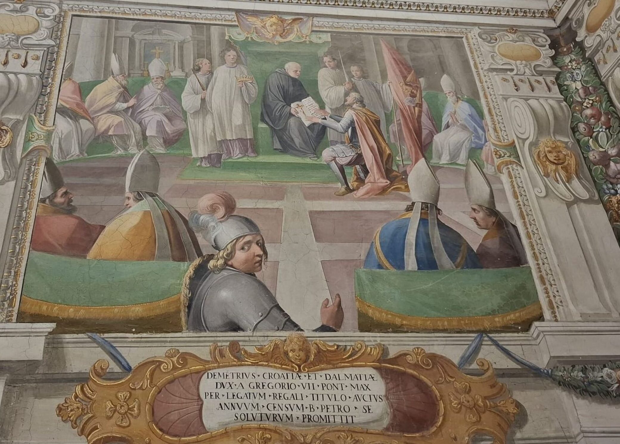 U povodu svete jubilejske 2025. godine po prvi put u povijesti za posjetitelje Vatikanskih muzeja otvorene su i Paulinske sobe (Sale paoline), tri prostorije Vatikanskog apostolskog arhiva (koji se do 2019. zvao Vatikanski tajni arhiv) gdje je postavljena izložba „Jubileji. Rijetki dokumenti iz vatikanskih zbirki“ posvećena ranijim jubilejima. Izloženi su dragocjeni predmeti, među njima i originalna bula pape Bonifacija VIII. o proglašenju prvog jubileja 1300. godine, a pažnju većine posjetitelja privlače uobičajeni klesarski alati, poput čekića ili lopatica koje su pape ili njihovi izaslanici koristili za otvaranje i zatvaranje svetih jubilejskih vrata na rimskim bazilikama. Kao i većina ostalih prostorija Apostolske palače u Vatikanu, i Paulinske sobe oslikane su freskama s prikazima povijesnih scena, njih ukupno 26, a podno jedne od njih u drugoj sobi po redu može se pročitati latinski natpis: „Demetrius Croatiae et Dalmatiae Dux a Gregorio VII. Pont. Max, per legatum regali titulo auctus annuum censum. B. Petro se soluturum promittit.“ Demetrius je naravno hrvatski kralj Zvonimir koji se drugim imenom nazivao Dimitrije, Demetrije ili Dmitar, a natpis navodi da je kao vladar Hrvatske i Dalmacije uzvišen kraljevskim naslovom po legatu prosvećenika Grgura VII. i da zauzvrat obećava godišnji danak svetom Petru. Dogodilo se to 8. listopada 1076. kada je u crkvi svetih Petra i Mojsija u Solinu opat Gebizon, izaslanik pape Grgura VII., okrunio Zvonimira kraljevskom krunom. Ovaj čin prikazan je u dnu freske, duge tri, a visoke dva metra, na kojoj vidimo Zvonimira prikazanog iz profila kako klečeći polaže prisegu na Evanđelje koje u ruci drži papinski izaslanik u benediktinskom redovničkom ruhu, a kraj njega njegovi pomoćnici drže svaki po jedan znak kraljevskog dostojanstva: krunu, žezlo, mač i crvenu zastavu s papinskim znakom. Na fresci je i osam biskupa s mitrama, a u prvom planu ističe se mladić u oklopu s kacigom na glavi koji licem okrenut prema gledatelju desnom rukom pokazuje na središnji prizor. Ovu i ostalih 25 fresaka između 1610. i 1614. naslikao je je talijanski barokni slikar Marzio Ganassini i očito je u liku ovog mladića ostavio svoj autoportret.