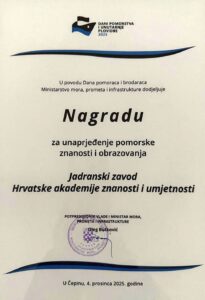 Jadranski zavod Hrvatske akademije znanosti i umjetnosti ovogodišnji je dobitnik Nagrade za doprinos unaprjeđenju pomorske znanosti i obrazovanja koju dodjeljuje Ministarstvo mora, prometa i infrastrukture. Nagradu je na svečanoj akademiji održanoj 3. prosinca 2025. u Čepinu preuzela dr. sc. Vesna Skorupan Wolff, znanstvena savjetnica u trajnom zvanju i upraviteljica Jadranskog zavoda.
