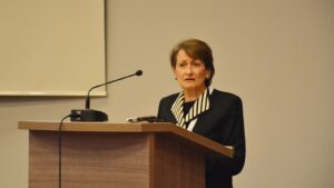 Prof. dr. sc. Milica Lukić s Filozofskog fakulteta u Osijeku izlagala je o temi Hrvatsko kraljevstvo u suvremenom jezičnom krajobrazu. Uglavljujući se u nacionalnoidentitetsku temu 1100. obljetnice Hrvatskoga kraljevstva, cilj je izlaganja bio obuhvatiti ključne pojmove koji čine semantičko polje toga termina na hrvatskom geografskom (i kulturnom) prostoru – Hrvatsko kraljevstvo, kralj Tomislav, Grgur Ninski, Sveta braća, (Konstantin-)Ćiril i Metod, ćirilometodska baština, glagoljica, glagoljaši, glagoljaštvo i dr. Zastupljenost se tih pojmova razmatra u (polu)službenim zemljopisnim imenima ulica, uličnih odvojaka, prilaza, prolaza, stuba, trgova, parkova, perivoja te ostalih javnih natpisa, ali i u obliku spomenika te skulptura smještenih u vanjskom prostoru kao njegovih informacijskih i semantičkih obilježja. Kvalitativna i kvantitativna analiza bit će ujedno i pokazatelj razine obaviještenosti i osviještenosti onih koji kreiraju i njeguju nacionalni jezični krajolik.