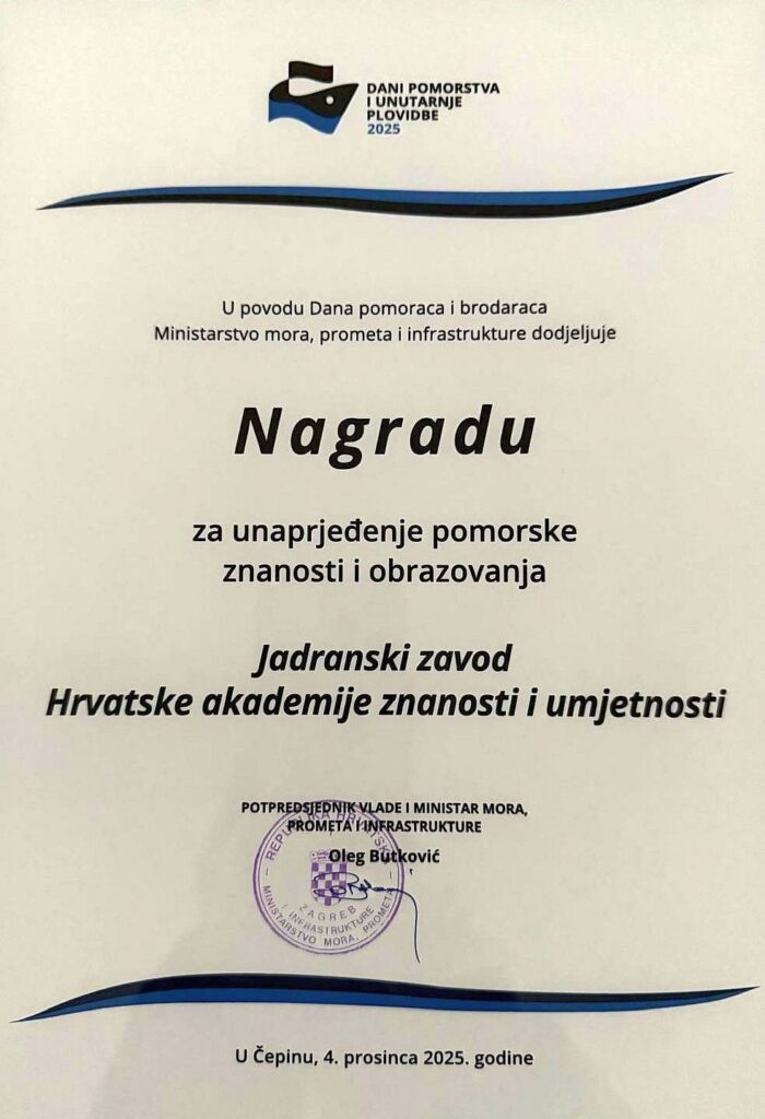 Jadranski zavod HAZU dobitnik Nagrade za doprinos unaprjeđenju pomorske znanosti i obrazovanja
