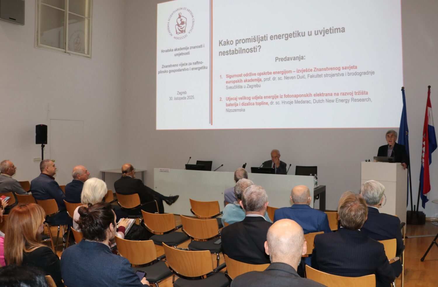 U okviru teme Kako promišljati energetiku u uvjetima nestabilnosti?, Znanstveno vijeće za naftno-plinsko gospodarstvo i energetiku Hrvatske akademije znanosti i umjetnosti organiziralo je u četvrtak 30. listopada 2025. u dvorani Knjižnice HAZU predavanja Sigurnost održive opskrbe energijom – izvješće Znanstvenog savjeta europskih akademija (prof. dr. sc. Neven Duić, Fakultet strojarstva i brodogradnje Sveučilišta u Zagrebu) i Utjecaj velikog udjela energije iz fotonaponskih elektrana na razvoj tržišta baterija i dizalica topline (dr. sc. Hrvoje Medarac, Dutch New Energy Research, Nizozemska).