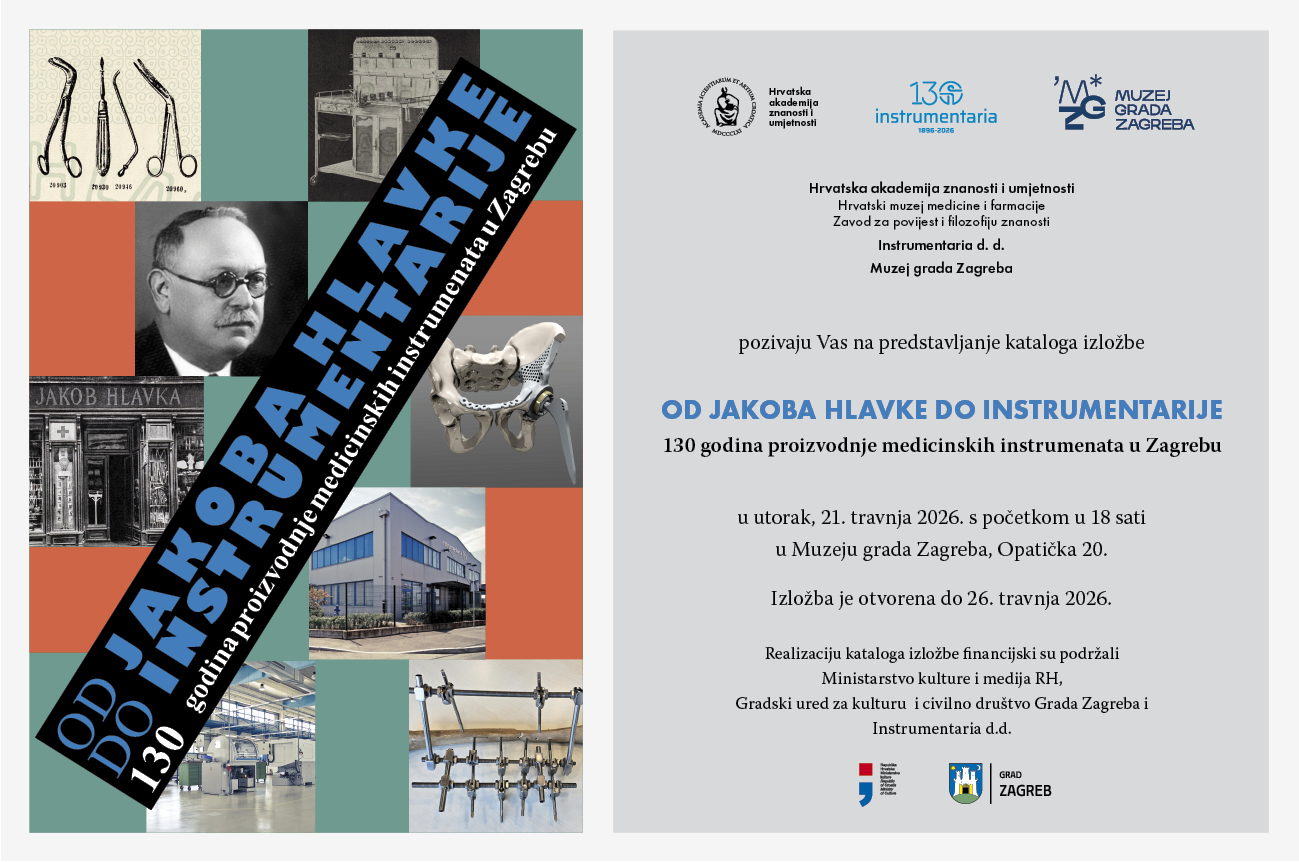 U utorak 21. travnja 2026. u 18 sati u Muzeju grada Zagreba, Opatička 20, Zagreb, održat će se predstavljanje kataloga izložbe „Od Jakoba Hlavke do Instrumentarije: 130 godina proizvodnje medicinskih instrumenata u Zagrebu“ čiji je nakladnik Hrvatski muzej medicine i farmacije Hrvatske akademije znanosti i umjetnosti. Bogato ilustrirani katalog opsega 97 stranica, s tekstom na hrvatskom i engleskom jeziku, izdan je uz istoimenu izložbu organiziranu povodom 130. obljetnice osnutka tvornice Jakoba Hlavke u Zagrebu, čiji je sljednik tvrtka Instrumentaria d.d. Autorice izložbe i kataloga su Silvija Brkić Midžić i izv. prof. dr. sc. Stella Fatović-Ferenčić, dr. med., a vizualni identitet, likovni postav izložbe te grafičko oblikovanje kataloga potpisuje Ante Rašić. Na predstavljanju će govoriti voditelj Hrvatskog muzeja medicine i farmacije HAZU akademik Marko Pećina, recenzenti kataloga prof. dr. sc. Darko Antičević, dr. med., i predsjednik Hrvatsko-češkog društva Marijan Lipovac, suurednica i koautorica teksta kataloga prof. dr. sc. Stella Fatović-Ferenčić te u ime obitelji Hlavka prof. dr. sc. Vladimir Hlavka, dr. med., unuk Jakoba Hlavke.
