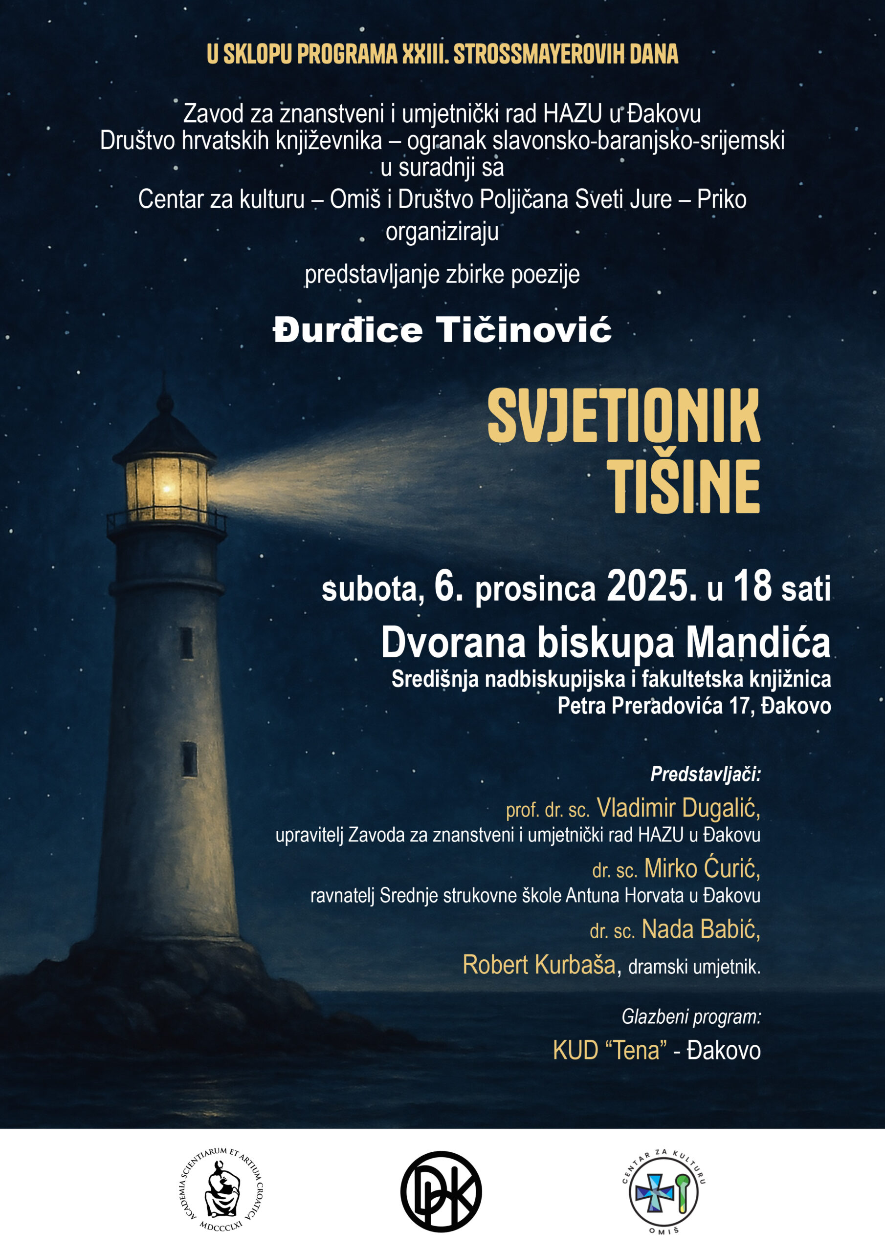 Zbirka pjesama Svjetionik tišine Đurđice Tičinović bit će predstavljena u subotu 6. prosinca 2025. u Dvorani biskupa Mandića Središnje nadbiskupijske i fakultetske knjižnice u Đakovu, P. Preradovića 17, s početkom u 18 sati.