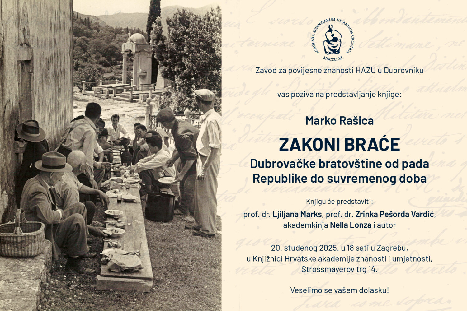 Zavod za povijesne znanosti Hrvatske akademije znanosti i umjetnost u Dubrovniku organizira predstavljanje knjige Marka Rašice Zakoni braće: dubrovačke bratovštine od 1808. do 2015. koje će se održati u četvrtak 20. studenog 2025. u 18 sati u Knjižnici HAZU u Zagrebu. Uz autora, knjigu će predstaviti prof. dr. sc. Ljiljana Marks, prof. dr. sc. Zrinka Pešorda Vardić i akademkinja Nella Lonza.