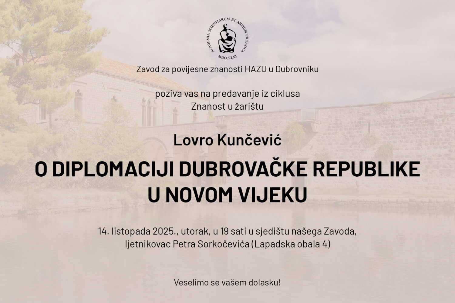 Zavod za povijesne znanosti Hrvatske akademije znanosti i umjetnosti u Dubrovniku organizira predavanje iz ciklusa Znanost u žarištu o diplomaciji Dubrovačke Republike u novom vijeku koje će održati dr. sc. Lovro Kunčević, član suradnik HAZU, u utorak 14. listopada 2025. u 19 sati u sjedištu Zavoda (ljetnikovac Petra Sorkočevića), Lapadska obala 4 u Dubrovniku.