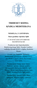 Pod visokim pokroviteljstvom Hrvatske akademije znanosti i umjetnosti otvara se 37. Knjiga Mediterana. Otvaranje manifestacija u organizaciji Književnog kruga Split i Zavoda za znanstveni i umjetnički rad HAZU-a u Splitu održat će se u Staroj gradskoj vijećnici u Splitu, u nedjelju, 5. listopada 2025. u 17,30 sati. Manifestacija je otvorena do 11. listopada 2025.
